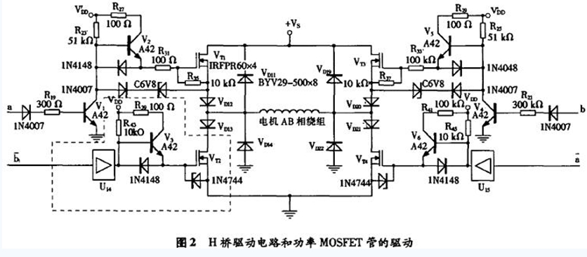 功率MOSFET管有內(nèi)接的快恢復(fù)二極管。當(dāng)不接VD11,VD12,VD13,VD14時(shí),假定此時(shí)電機(jī)AB相繞組由VT1管(和VT4管)驅(qū)動,即VT2管(和VB)截止,VT1管(和VT4管)導(dǎo)通,電流經(jīng)VT1管流過繞組。當(dāng)下一個(gè)控制信號使VT1管關(guān)斷時(shí),負(fù)載繞組的續(xù)流電流經(jīng)VT2的內(nèi)接快恢復(fù)二極管從地獲取。此時(shí),VT2管的漏源電壓即是該快恢復(fù)二極管的通態(tài)壓降,為一很小的負(fù)值。當(dāng)VT1再次導(dǎo)通時(shí),該快恢復(fù)二極管關(guān)斷,VT2的漏源電壓迅速上升,直至接近于正電源的電壓+VS,這意味著VT2漏源間要承受很高且邊沿很陡的上升電壓,該上升電壓反向加在VT2管內(nèi)的快恢復(fù)二極管兩端,會使快恢復(fù)二極管出現(xiàn)恢復(fù)效應(yīng),即有一個(gè)很大的電流流過加有反向電壓的快恢復(fù)二極管。為了抑制VT2管內(nèi)的快恢復(fù)二極管出現(xiàn)這種反向恢復(fù)效應(yīng),在圖2電路中接人了VD11,VD12,VD13,VD14。其中,反并聯(lián)快恢復(fù)二極管VD11,VD14的作用是為電機(jī)AB相繞組提供續(xù)流通路,VD12,VD13是為了使功率MOSFET管VT1,VT2內(nèi)部的快恢復(fù)二極管不流過反向電流,以保證VT1,VT2在動態(tài)工作時(shí)能起正常的開關(guān)作用。VD19,VD20,VD21,VD22的作用亦是同樣的道理。