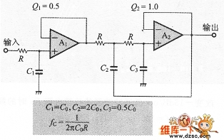 圖4的構成與1次和2次電路級聯的方法相比較,電路簡單化。而且也能用同一常數構成。另外,OP放大器A,上具有增益,通過A1,的正反饋(省略A2),使OP放大器的個數減少了1個。注意這里需要通頻帶的增益為1.82倍。