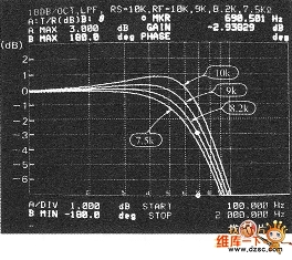 而現在還不清楚在電路中用于最平坦特性的正反饋量的計算步驟,所以可用實驗來求得。圖3是C=0.01μF、RF=16kΩ(通常fc=1kHz),反饋電阻RF在7.5k~10kΩ變化時的頻率特性。標識點為8.2kΩ的曲線被認為是最平坦的反饋電阻值。