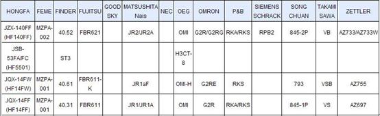 以繼電器為例,廈門宏發(fā)的繼電器產(chǎn)品能對富士通、歐姆龍、松下電工、松川等國際公司的產(chǎn)品進(jìn)行替代。具體可見下圖,如廈門宏發(fā)的JZX-140FF系列產(chǎn)品可以替代富士通FBR621、OMRON的G2R/G2RG、P&B的RKX/RKS系列產(chǎn)品等。