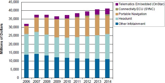 圖1所示為iSuppli公司關于2006-2014年全球汽車信息娛樂系統銷售額的預測。