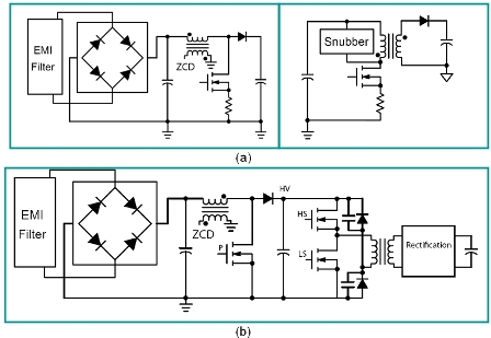 如前所述,一旦功率大于75 W,除了滿足上述工作能效及空載能耗要求外,電路中還面臨著加入PFC的要求,這在改善功率因數(shù)、使電網(wǎng)電能得到更高效利用的同時,也會使得電路結(jié)構(gòu)更為復(fù)雜。在這類應(yīng)用中,傳統(tǒng)電源架構(gòu)是PFC+PWM的兩段式架構(gòu),即在非連續(xù)導(dǎo)電模式(DCM)或臨界導(dǎo)電模式(CrM)段后跟隨著準(zhǔn)諧振反激段,每個段都使用一個控制器,如圖2(a)所示。