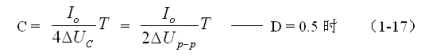(1-17)和(1-18)式,就是計算串聯式開關電源儲能濾波電容的公式(D = 0.5時)。式中:Io是流過負載的電流,T為控制開關K的工作周期,ΔUP-P為輸出電壓的波紋。電壓波紋ΔUP-P一般都取峰-峰值,所以電壓波紋正好等于電容器充電或放電時的電壓增量,即:ΔUP-P = 2ΔUc 。