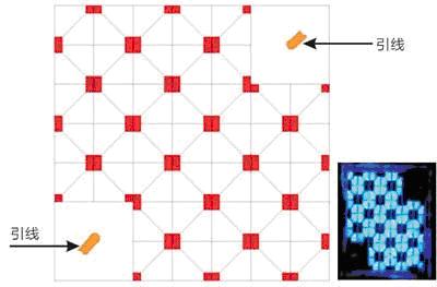 AC LED光源的重大技術(shù)突破是超細(xì)LED晶粒在封裝時的特殊排列組合技術(shù),同時利用LED PN結(jié)的二極管特性兼作整流,半導(dǎo)體制程在其中扮演著相當(dāng)重要的角色。AC LED通過半導(dǎo)體制程整合成一堆微小晶粒,采用交錯的矩陣式排列工藝,并加入橋式電路至芯片設(shè)計,使AC電流可雙向?qū)ǎ瑢?shí)現(xiàn)發(fā)光。晶粒的排列如圖2所示,左圖是AC LED晶粒采用交錯的矩陣式排列示意圖,右小圖是實(shí)際AC LED晶粒排列照片,AC LED晶粒在接上交流后通體發(fā)光,因此只需要二根引線導(dǎo)入交流源即能發(fā)光工作。