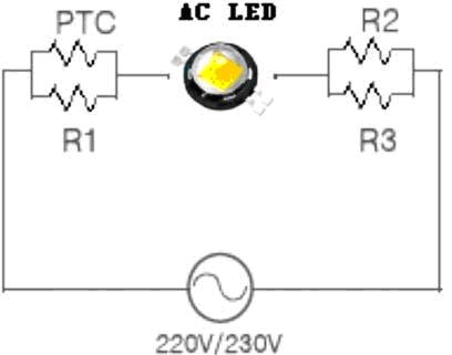 AC LED的典型應(yīng)用電原理圖如圖6所示十分簡單,在AC LED兩端分別串入正溫度系數(shù)熱敏電阻PTC,和限流電阻R1、R2、R3,接上110V或220V交流即可進(jìn)入照明工作。