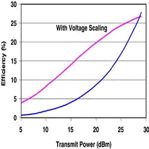動態/可適性電壓調整技術(DVS/AVS)與高整合度組件所使用的方式很類似,它會把閉回路系統中的處理器和穩壓器連結在一起,并在確保系統正常工作的情形下,將數字電源供應的輸出電壓動態調整至最小值。功率放大器會被最佳化,使它在最大傳送功率下擁有最高效率。由于絕大多數手機都在基地臺附近工作,手機的無線電功能會在維持通訊質量的前題下,將傳送功率降至最低水平。當功率放大器在較低的功率水平下工作時,它的效率會受到影響,從(圖三)可以看出,利用動態電壓調整技術來調整功率放大器的電壓,它的工作效率會增加10%至20%。