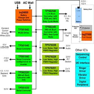 在這個解決方案中,就算鋰離子電池下降至3.3V左右,在100%負載周期模式下工作的高效率TPS62200降壓轉換器仍能提供3.3V的I/O電壓。上述所有零件都采用SOT-23封裝,除了bq24020電池充電組件、TPS61020升壓轉換器以及TPS61042白光二極管驅動組件之外,它們是采用3×3平方厘米的QFN封裝。TPS61040和TPS61042還內建上端FET晶體管,每顆組件只需要一個外接二極管。bq24020、TPS622xx、TPS61020和線性穩壓器組件全都內建FET晶體管,功率放大器和中央處理器電源采用的動態電壓調整技術可以提高每顆零件的效率,進而協助降低功耗。