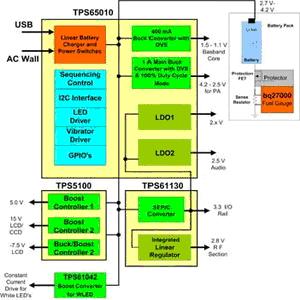 在此解決方案中,3.3VI/O電源是由SEPIC轉換器提供,它讓應用系統能充份利用鋰離子電池電力,直到電池電壓降至最低水平(大約2.7V)。和離散解決方案一樣,穩壓器輸出也來自3.3V輸入電源,以便提高工作效率。TPS65010采用48只接腳QFN封裝,這些組件都內建FET晶體管。TPS61130SEPIC轉換器采用4×4平方厘米QFN封裝,并且內建FET晶體管,最高達到90%以上效率,TPS5100則是三通道輸出控制器,專門用來提供電源給顯示器。功率放大器和中央處理器電源使用的動態電壓調整技術可以改善每顆零件的效率,進而協助降低功耗。