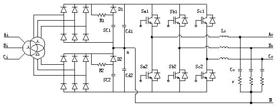 圖中,SC為超級電容(SuperCapacitor),R為SC充電電阻,D為SC放電二極管,Cd為直流平波電容器,Sa~Sc為IGBT器件,L0及C0為輸出濾波器的電感和電容。交流輸入側(cè)采用Y/Y/D接線的三繞組輸入變壓器及兩組三相不控整流電路構(gòu)成12脈波整流系統(tǒng),注入系統(tǒng)的諧波電流次數(shù)為12k±1,數(shù)值高,因此在無特殊要求場合,不用考慮設(shè)置濾波電路。