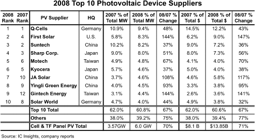 從事半導(dǎo)體相關(guān)市場調(diào)查的美國IC Insights的調(diào)查顯示,2008年全球太陽能電池單元和面板市場規(guī)模為比上年增加70%的6.0GW。全球銷售額也為比上年增加71%的138億5000萬美元。