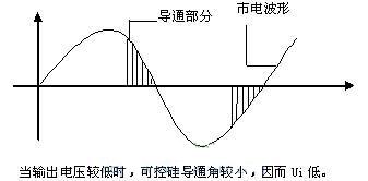 而當輸出電壓Uo很低時,可控硅導通角很小,絕大部分市電電壓被可控硅“卡斷了”(如下圖所示),只讓很低的電壓加在變壓器初級,即Ui很低,這當然經(jīng)整流濾波后輸出電壓也就很低了。