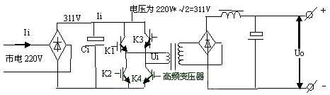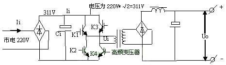 由電路可以看出,市電經(jīng)整流濾波后變?yōu)?11V高壓,經(jīng)K1~K4功率開關管有序工作后,變?yōu)槊}沖信號加至高頻變壓器的初級,脈沖的高度始終為311V。當K1,K4開通時,311V高壓電流經(jīng)K1正向流入主變壓器初級,經(jīng)K4流出,在變壓器初級形成一個正向脈沖。