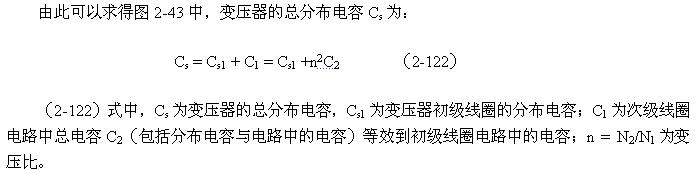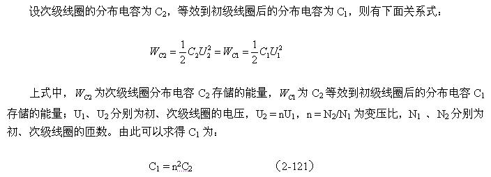 (2-122)式中,Cs為變壓器的總分布電容,Cs1為變壓器初級線圈的分布電容;C1為次級線圈電路中總電容C2(包括分布電容與電路中的電容)等效到初級線圈電路中的電容;n = N2/N1為變壓比。