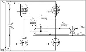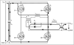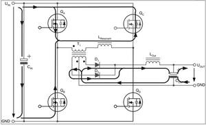 兩個互為對角的全橋開關不是同時驅動,而是通過相移的方法在啟動命令之間引入預定義的短期延遲。這種延遲由控制電路的電壓回路進行調節,從而在兩個驅動信號之間產生相移。這種相移技術的特殊之處在于,它可啟動兩個與變壓器串聯的開關,而變壓器的電壓卻為零。