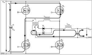 與傳統的全橋轉換器一樣,互為對角的開關一起驅動,對角開關交替地將變壓器原邊置于輸入電壓VIN上一段時間。只有在開關打開時才向輸出部分供電,這與工作在固定頻率上的特定占空比相一致。