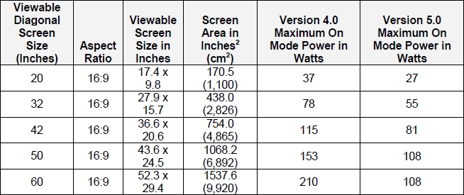 又如平板電視,隨著尺寸的增大,其能耗日益成為業(yè)界關(guān)注的問題。“能源之星”針對電視的4.0版規(guī)范將于2010年5月1日生效,這規(guī)范要求可視屏幕對角尺寸為32英寸、42英寸和60英寸的平板電視在工作模式的能耗分別不超過78 W、115 W和210 W,而后續(xù)將于2012年5月1日生效的5.0版規(guī)范則進(jìn)一步要求這幾種尺寸平板電視工作能耗不超過55 W、81 W和108 W,參見表1。歐洲的EuP指令也有著類似要求。除了要求工作能耗降低,這些規(guī)范還要求降低待機(jī)能耗,因?yàn)閿?shù)據(jù)顯示,可觀的電能是在待機(jī)模式下消耗的。“能源之星”等能效規(guī)范當(dāng)前對待機(jī)能耗的要求是不超過1 W,未來可能要求不超過0.3 W甚至是不超過0.1 W。