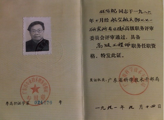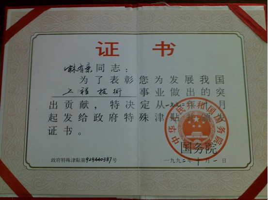 林有親先生的榮譽(yù)證書