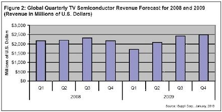 2010年市場更加接受互聯網驅動、支持LED背光和100/120Hz幀速率轉換技術等功能的先進電視,將有利于推動電視半導體市場達到新的高度。iSuppli公司目前預測,2010年電視半導體營業收入將比2009年增長19%。