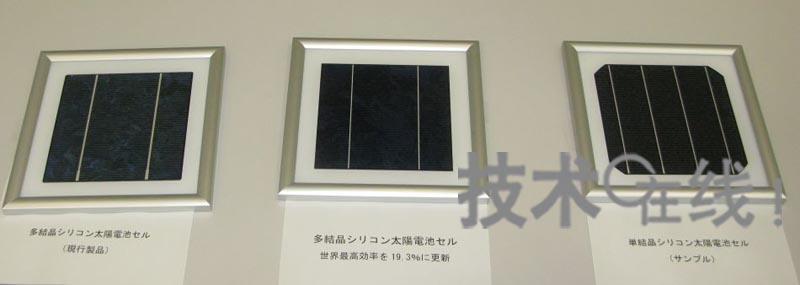 左起依次為現有的多晶Si電池單元、單元轉換效率為19.3%的多晶Si電池單元,以及此次宣布涉足市場的單結晶Si電池單元(樣品)。