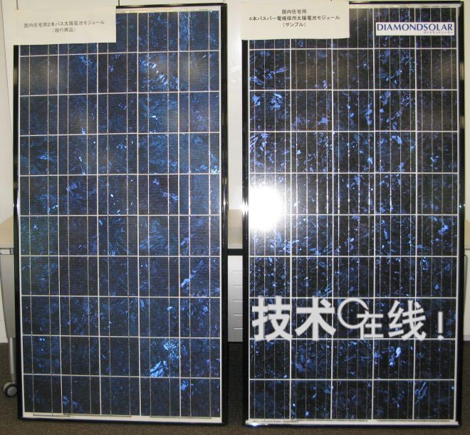 現有的輸出功率185W多晶Si型面板(左)和將于2010年6月投放日本市場的190W多結晶Si型面板。通過將各單元上作為電極的總線布線從2根增至4根,提高了輸出功率。