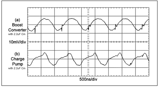 圖5.如果開關頻率為1MHz,驅動同樣數(shù)量的LED,采用相同的輸入電容,那么電荷泵(b)和升壓轉換器(a)的輸入紋波基本相同。然而,由于電荷泵與LED之間有較多引線,建議使用更短的連線(天線),另外,泵電容產(chǎn)生的EMI低于升壓轉換器的電感。
