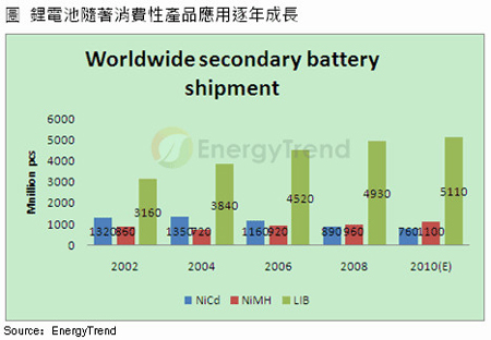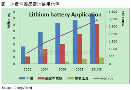 鋰電池出貨隨消費性應用增加逐年成長