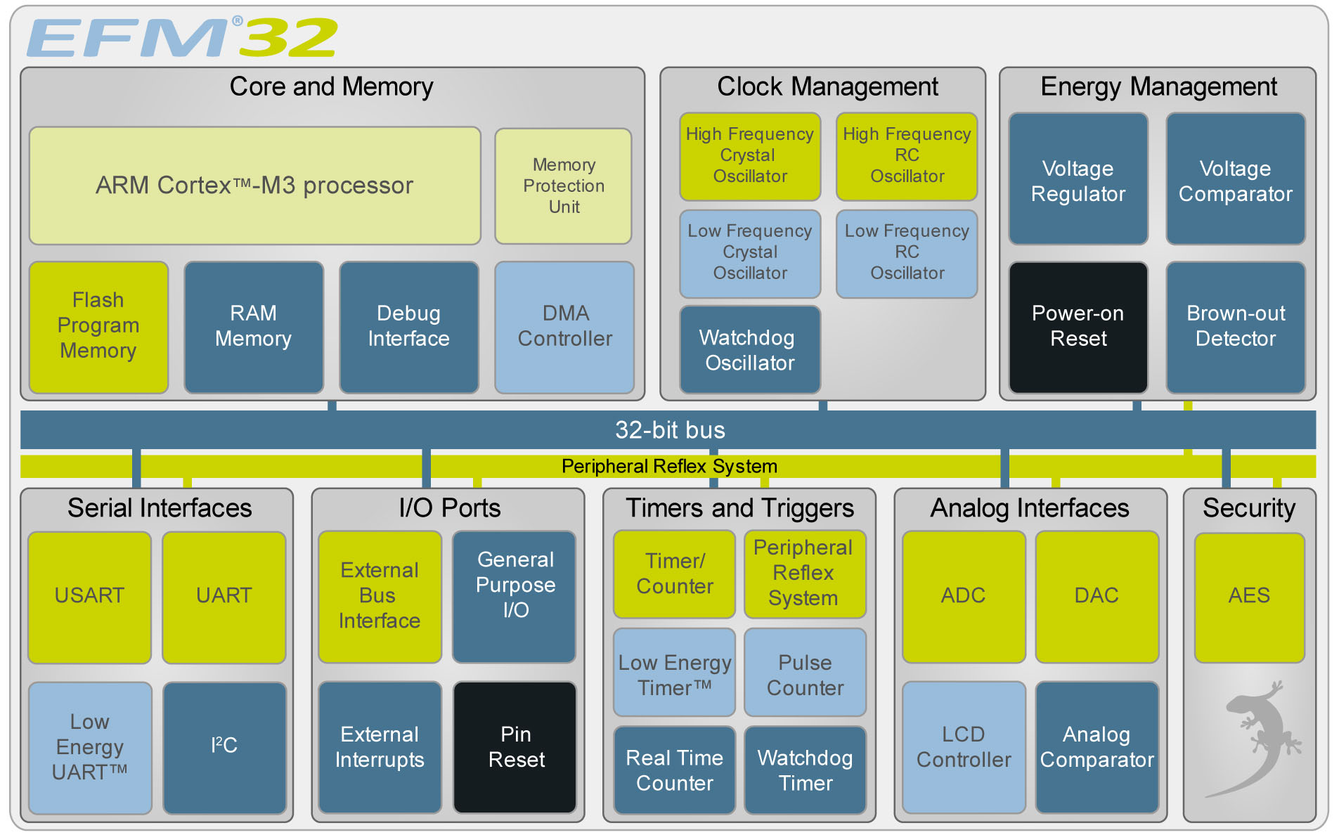 EFM32總共使用6個(gè)定制設(shè)計(jì)的振蕩器,提供快速的喚醒時(shí)間,使內(nèi)核從睡眠模式中更快開始處理。它通過使用僅有0.5微秒啟動(dòng)時(shí)間的內(nèi)部RC振蕩器來達(dá)到這個(gè)目的。這使得內(nèi)核可以更快地從睡眠中喚醒、評(píng)估和執(zhí)行任務(wù) - 因此電源效率比其它設(shè)備高。