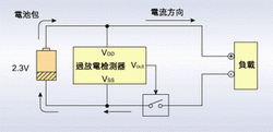 隨著使用時間的增加,已充過電的鋰離子電池電壓會逐漸降低,最后低到規格標準值以下,此時就需要再度充電。若未充電而繼續使用,可能造成由于過度放電而使電池不能繼續使用。為防止過度放電,保護IC必須檢測電池電壓,一旦達到過度放電檢測電壓以下,就得使放電一方的功率MOSFET切斷而截止放電。但此時電池本身仍有自然放電及保護IC的消耗電流存在,因此需要使保護IC消耗的電流降到最低程度。