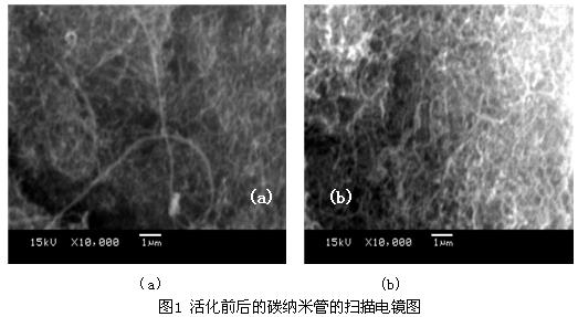 碳納米管一般是由為數(shù)眾多的芳香不定域碳原子組成的極端疏水的大分子,幾乎不溶于任何溶劑,并在溶液中較易聚集成束,這些特性限制了碳納米管本身所具有的作為電極材料的優(yōu)良特性。所以在制備電極之前,材料的活化處理很重要,本文以強(qiáng)氧化性的20%硝酸溶液浸泡處理多壁碳納米管25min,可以充分浸潤碳納米管陣列,從而使離子嵌入碳層,產(chǎn)生利于電容性的孔結(jié)構(gòu)。并能溶解由前軀體處理造成溶解在管上的鐵、鎳催化劑和其他酸溶性的雜質(zhì)。