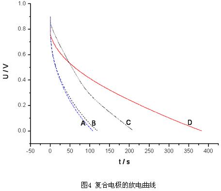 圖4給出了各電極在恒定電流為2mA的情況下的放電曲線,可以看出各電極均具有良好的線性放電性質(zhì)。由公式(1)計(jì)算得出A、B、C和D四種電極材料的比電容分別為51.3F/g、56.2F/g、93.2F/g和126F/g。由上節(jié)分析可知,雙電層和法拉第贗電容的共同作用,提高了活性炭/二氧化錳復(fù)合電極的容量,同時也表現(xiàn)出了良好的放電特性。在對電容容量的貢獻(xiàn)上,二氧化錳的作用要優(yōu)于碳納米管。