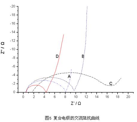此外由圖5也可以看出,當(dāng)電極中碳納米管的含量增加時,傳遞電阻呈現(xiàn)遞減的趨勢。這是由于碳納米管在導(dǎo)電性上具有活性炭不可比擬的優(yōu)點(diǎn):碳納米管可以看成是六邊形的石墨層在空間通過360°卷曲而成,隨著在電極中含量的增加,碳納米管交織纏繞的程度增大,為電解液離子提供了良好的導(dǎo)電通道。因此,隨著含量的增加,阻抗圓的半徑減小,使得復(fù)合電極材料的阻抗特性越好。