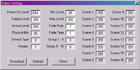 當程序第一次加載時,“電子鎮流器設置(Ballastsetting)”窗口將沒有數據顯示,要完成一只實際電子鎮流器的設置,應在主界面設置適應的地址,并按下“電子鎮流器設置(Ballastsetting)”窗口中的“Down/Load”按鈕。
