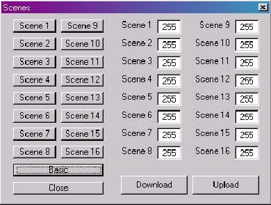 按下“scenexx”按鈕可工作在預先定義的背景級,背景級的選擇支持所有工作模式,利用主界面的“廣播”尋址并按下“scene3”按鈕將使所有電子鎮流器預先定義的“scene3”背景級(如果預先有定義)。