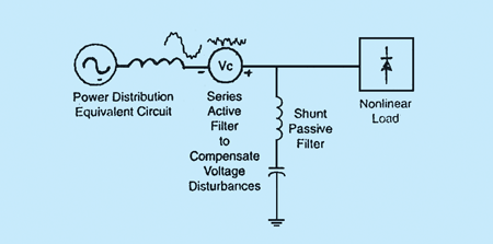 串聯型APF是從1980年未引用于電網的,它主要作為電壓調節器及電網與非線性負荷之間的諧波隔離器而工作的。圖7為串聯APF的接線圖,通過匹配變壓器將APF串聯于電源和負荷之間,以消除電壓諧波、平衡或調正負荷的端電壓,可確保用戶供電的電壓質量,尤其適合于補償交流電源及小功率應用中的電壓不平衡與電壓的下陷。因不需能量貯備(蓄電池),元器件的總定額較小,對UPS更為經濟有效。串聯APF注入與電源電壓串聯的電壓分量,故可視為一可控的電壓源,補償負荷側的電壓下陷和上凸。但串聯型APF損耗較大,且各種保護電路也較復雜,故很少單獨使用。經常用它與無源LC濾波網絡組成混合型APF。