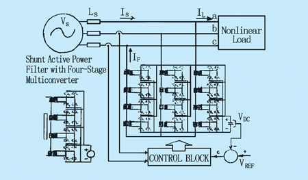 一直處于研究階段的多級逆變器,最近被用于APF拓撲中,圖11為配有三級逆變器的并聯APF,今天在大多數的逆變器應用領域,三級逆變器已愈益普及,例如功率因數補償器。多級變換器的優點是能降低APF產生的諧波含量。因與普通變頻器比較,能輸出更多(>2級)的電壓,這一特點有利于減少濾波器本身產生的諧波。另一優點是能減少半導體電壓或電流的定額,以及減少所需的開關頻率。