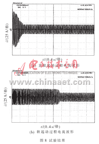 圖8為電機(jī)起動(dòng)過(guò)程實(shí)測(cè)電流波形,圖8(a)為直接起動(dòng)過(guò)程電流波形,圖8(b)為軟起動(dòng)過(guò)程電流波形。可見(jiàn)整個(gè)軟起動(dòng)過(guò)程中電流的變化很平穩(wěn),沒(méi)有出現(xiàn)振蕩現(xiàn)象,電機(jī)軟起動(dòng)時(shí)的起動(dòng)電流是其穩(wěn)定運(yùn)行電流的2倍左右,而直接起動(dòng)非常迅速,啟動(dòng)電流很大,直接起動(dòng)時(shí)的起動(dòng)電流是其穩(wěn)定運(yùn)行電流的5~7倍。試驗(yàn)結(jié)果表明,所設(shè)計(jì)的軟起動(dòng)器系統(tǒng)效果良好,起動(dòng)過(guò)程平穩(wěn),無(wú)沖擊和振蕩。