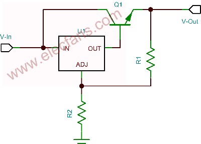 計(jì)算過(guò)程中輸入電流的使用,使得穩(wěn)壓器靜態(tài)或接地電流均得到考慮。在要求負(fù)載電流大于穩(wěn)壓器承受能力的情況下,可以添加一個(gè)外部晶體管,如圖4所示。這種做法僅適用于可調(diào)輸出穩(wěn)壓器。