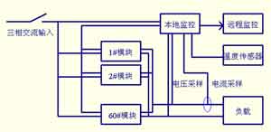 大功率電動汽車充電機的輸入為額定線電壓380V、50Hz的三相交流電,輸出額定電壓700V,額定電流600A。系統采用19"標準機架,結構緊湊、布局合理、外型美觀大方。外型尺寸:高×寬×深為2200mm×600mm×600mm。采用60個模塊并聯,每個模塊10A/700V,模塊尺寸:高×寬×深為133mm×425mm×270mm,15層4列,分四個柜體安放,四個柜體可分開運輸,使用時緊湊左右排列。機架前門、后門均為雙開門,方便檢修。電源進線和匯流排輸出位置均在底部輸入。電源輸入斷路器及監控單元觸摸屏安裝在主機中間控制柜前部。充電機控制結構示意圖如圖2所示。