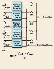 Aeroflex平衡電路使用共享總線,這個總線的電壓等于所有電池的平均電壓。平衡電路由那些超過共享總線電壓的電池充電并將電能注入到電壓較低的電池,這個工作是通過高效率的雙邊DC/AC轉換器來完成的。
