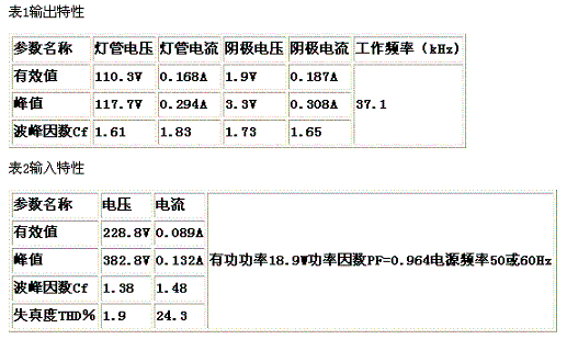 從圖3、4和表3、4中有關數據可以看出,它的輸入電流導通角為180°,沒有死區,電壓、電流基本同相位。PF>0.97,電流諧波在18%左右,Cf在1.6左右。由于電路簡單,工作又比較可靠,所以比較適用于電子鎮流器電路。