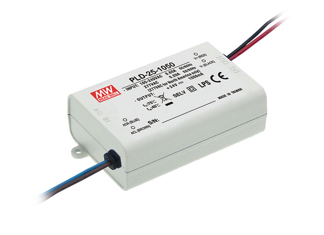 明緯繼完成了LPHC/LPLC-18(18W)、LPC-20(20W)、LPC-35(35W)、LPC-60(60W)等恒流式無(wú)PFC系列機(jī)種后,新推出了一款25W交流/直流具功率因子矯正(PFC)功能之塑料機(jī)殼型恒流式LED電源供應(yīng)器~PLD-25系列,以滿足需求低瓦數(shù)具PFC功能之室內(nèi)LED照明/裝飾光源相關(guān)應(yīng)用。PLD-25可接受90~295VAC交流輸入,除了可使用于一般115VAC或230VAC市電地區(qū),亦適用于北美地區(qū)277VAC之電力系統(tǒng)。