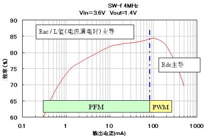 DC-DC轉(zhuǎn)換器的電源轉(zhuǎn)換效率和功率電感性能之間的關(guān)聯(lián)如圖3所示。PFM是指手機(jī)在待機(jī)狀態(tài)下保持低電流負(fù)荷的模式,這時電源轉(zhuǎn)換效率性能是與功率電感的Rac(交流電阻)以及電流-感值偏執(zhí)特性相關(guān)。圖4當(dāng)中顯示了各功率電感的Rac特性以及圖5中開關(guān)頻率數(shù)是4MHz的DC-DC轉(zhuǎn)換器IC的電源轉(zhuǎn)換效率特性。