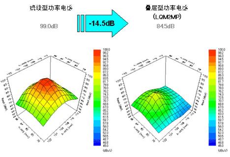 圖6顯示了繞線型功率電感和疊層型功率電感的磁束泄漏監(jiān)測數(shù)據(jù)。與一直以來作為DC-DC轉(zhuǎn)換器上使用的主要功率電感的繞線型功率電感相比,疊層型功率電感的磁束泄漏更少,現(xiàn)已證實閉合磁路的構(gòu)造使磁束泄漏較少。這些數(shù)據(jù)表明在小型高速開關(guān)DC-DC轉(zhuǎn)換器電路中使用小型疊層型功率電感的情況下,能夠發(fā)揮它抗噪特性的特長。