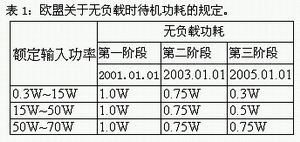在環保意識日益受到重視的綠色時代,有效利用有限的能源已經成為人們的共識。歐美國家對于電器產品在空載待機時的功耗定義了明確的規范,歐盟(EEC)公布的具體規定如表1所示,而在美國方面,從2001年7月起該國就規定政府機構不得購買待機功耗超過1W的電器產品。由此可見,在不久的未來,電源轉換器低待機功耗將成為基本要求,這也是電源設計工程師必須面臨的挑戰。