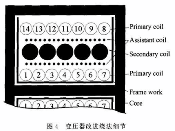 本文討論的電路中還存在前級電路和次級電路的輔助電源,它們也是由繞在變壓器上的獨立線圈提供能量的。這兩級輔助線圈的存在給噪聲電流的傳播提供了額外的途徑。輔助線圈是為了控制電路的供電設計的。盡管控制電路本身的功率很小,但它們的存在卻增大了電路對地的寄生電容,從而分擔了一部分把共模噪聲從活躍節點耦合到地的工作。然而把這些繞組夾在前級線圈和次級線圈的繞組中間就能增大前后級繞組的距離,從而它們的層間寄生電容就減小了,噪聲電流就能相應減小。因此,變壓器繞制的最終方法應如圖4所示。從內到外的線圈繞組依次是:前級繞組的一半、輔助繞組的一半、后級繞組、輔助繞組的另一半和前級繞組的另一半。