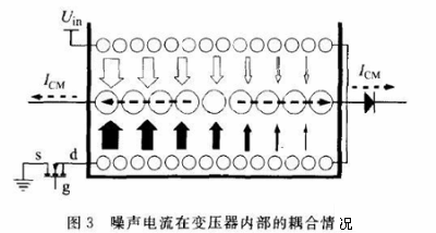 圖l中的共模電流, 在電路中的耦合途徑主要有3條:從噪聲源—— 功率開關管的d極通過C耦合到地;從噪聲源通過c。 耦合到變壓器次級電路,再通過C 耦合到地;從變壓器的前、次級線圈通過C?C 耦合到變壓器磁芯,再通過C 耦合到地。這3種電流是構成共模噪聲電流(圖1中的黑色箭頭所示)的主要因素。共模電流通過電源線輸入端的地線回流,從而被LISN取樣測量得到。