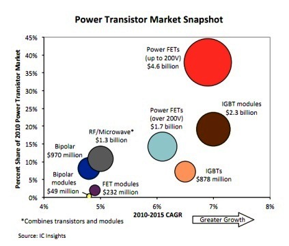 根據(jù)IC Insight的預(yù)測,整體功率電晶體市場營收將在2010至2015年間,取得6.4%的復(fù)合年平均成長率(CAGR),在2015年達到163億美元規(guī)模;同時期低電壓(200V以下)功率FET市場CAGR為6.7%,到2015年營收規(guī)模可達164億美元。