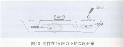 圖10是1A電流應(yīng)力下,模擬顯示該器件有兩個熱點。一個在收集極觸點下,損傷電流IT2=1.52A;另一個熱點在發(fā)射極之下,用外推法算出的損傷電流遠(yuǎn)大于2A。所以,首先出現(xiàn)導(dǎo)致失效的硅熔融點應(yīng)在收集極。