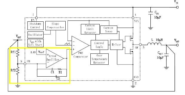 反饋電阻Rf1和Rf2的第一個(gè)作用是設(shè)置Buck電路的輸出電壓值,如圖2所示,穩(wěn)態(tài)時(shí),運(yùn)算放大器的反相輸入端和同相輸入端電壓是相等的,于是可以得到輸出電壓計(jì)算公式:,其中VREF是芯片內(nèi)部基準(zhǔn)電壓(本例中為0.6V)。
