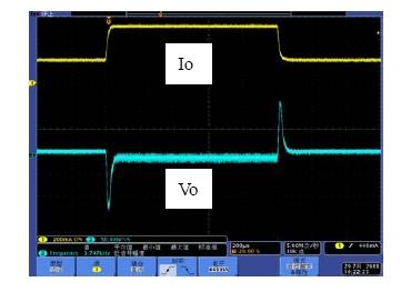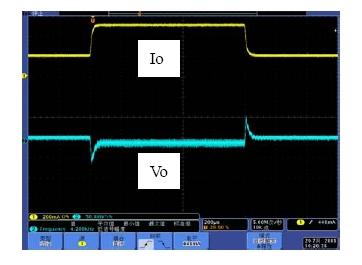 系統(tǒng)的帶寬是影響系統(tǒng)動(dòng)態(tài)響應(yīng)的重要因素,相位裕度是影響系統(tǒng)穩(wěn)定性的重要因素。如果選擇不同的Rf1,系統(tǒng)的帶寬和相位裕度會(huì)產(chǎn)生變化,也就是動(dòng)態(tài)響應(yīng)和穩(wěn)定性會(huì)發(fā)生變化。具體以表1來(lái)分析,當(dāng)Rf1從300k變到750k,系統(tǒng)地帶寬從51.1kHz變到26.1kHz,因此系統(tǒng)的動(dòng)態(tài)響應(yīng)會(huì)相應(yīng)的變差,而由于相位裕度都是足夠的,因此系統(tǒng)都處于穩(wěn)定工作的狀態(tài)。圖7和圖8是做負(fù)載切換的動(dòng)態(tài)響應(yīng)測(cè)試結(jié)果,從測(cè)試結(jié)果可以看出環(huán)路響應(yīng)速度變慢,導(dǎo)致輸出電壓過(guò)沖變大,動(dòng)態(tài)響應(yīng)效果變差。